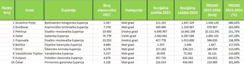 Dok mnogi gradovi simbolično izdvajaju za socijalnu zaštitu, neki pokazuju da se sustavna i velika ulaganja itekako isplate. Među 99 gradova koji su u 2024. godini povećali proračunska sredstva za socijalnu skrb prednjače Grubišno Polje, Đurđevac, Petrinja, Zadar, Popovača, Belišće, Drniš, Varaždinske Toplice, Kutjevo i Čabar.