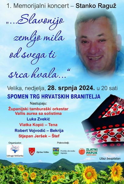 Županijski tamburaški orkestar Vallis Aurea danas će u Velikoj nastupiti na 1. memorijalnom koncertu – Stanko Raguž “Slavonijo zemljo mila od svega ti srca hvala…”. Koncert je organiziran u spomen na Stanka, istinskog ljubitelja tamburaške glazbe, dugogodišnjeg predsjednika udruge Veličanka, kulturno-umjetničkog društva “Ivan Goran Kovačić” i pokretača brojnih aktivnosti i događanja na području naše županije. Koncert će se održati u na Spomen trgu hrvatskim braniteljima u Velikoj s početkom u 20 sati.