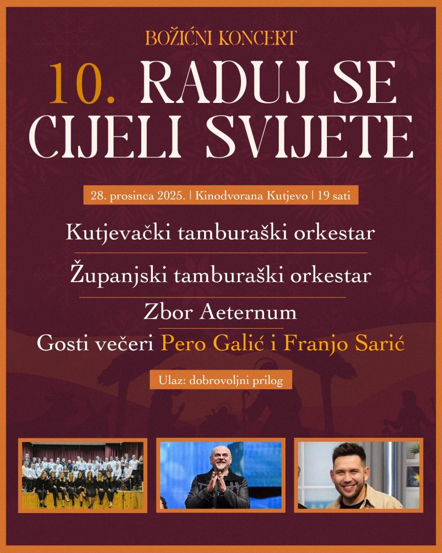 Koncert se održava danas, 28. prosinca u 19 sati u Kinodvorani Kutjevo. Uz Kutjevački tamburaški orkestar nastupit će Županjski tamburaški orkestar i Zbor Aeternum, a gosti koncerta su Pero Galić, bivši pjevač grupe Opća Opasnost, i Franjo Sarić, pjevač Tamburaškog sastava Vranac.