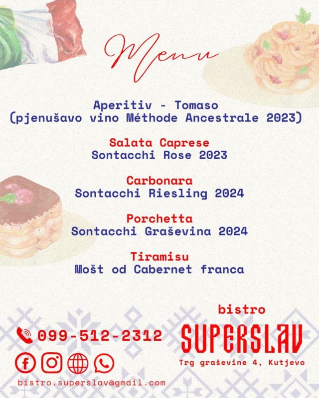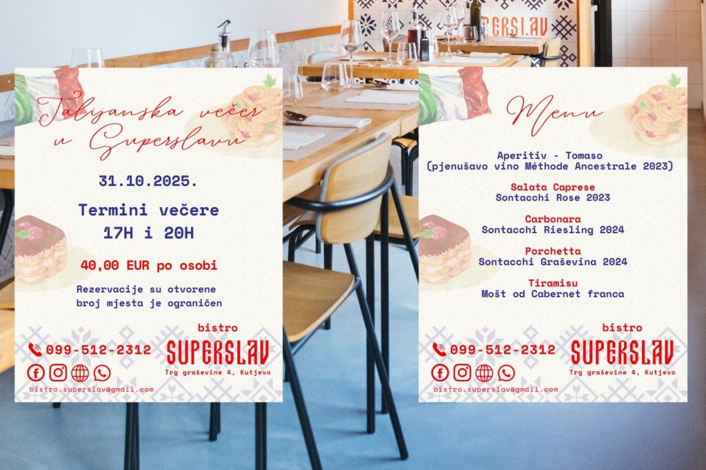 Bistro Superslav pripremio je za sve ljubitelje dobrog zalogaja i vina posebnu talijansku večer koja će se održati 31. listopada. Goste očekuje nezaboravno gastronomsko putovanje kroz okuse Italije uz pomno osmišljena jela talijanske kuhinje uparena s vrhunskim vinima Vinarije Sontacchi.