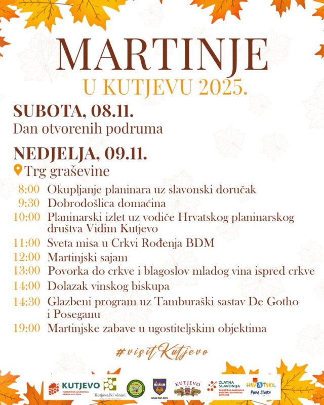 Dok jesen polako preuzima boje vinograda, u Kutjevu se već osjeća duh nadolazećeg Martinja. Svake godine, 11. studenoga, ovaj se dan obilježava s posebnom radošću i veseljem, jer se u srcu hrvatske vinske tradicije krsti mošt i dočekuje novi ciklus vina. Ove godine proslava se u Kutjevu održava u subotu i nedjelju, 8. i 9. studenog 2025., a posjetitelje očekuje bogat program prepun okusa, mirisa i zvukova Slavonije.